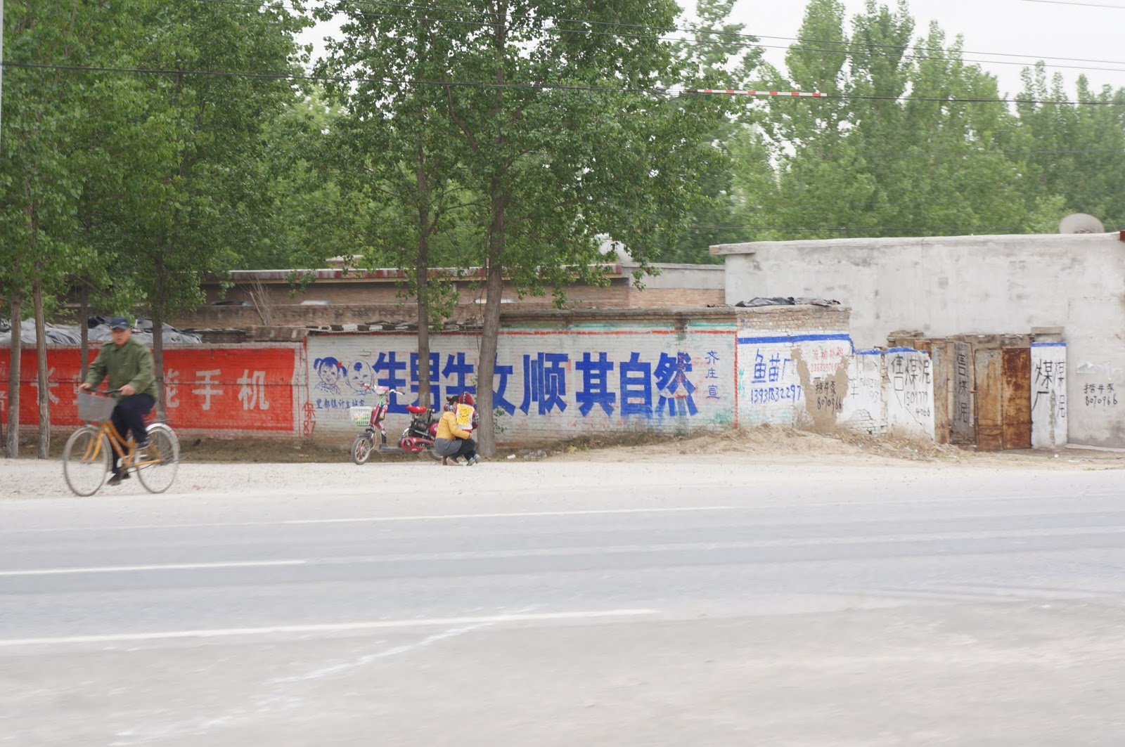 有大幅看板架在市區大樓頂的"發展才是硬道理",有橋墩上用油漆塗上的"損路可恥",另外真正最常見的方式,那怕是古色古香的民宅、毫不起眼的農舍或是殘破不堪準備拆除的圍牆,只要是立在大馬路旁又有一個夠大的平面空間,那就沒有任何讓它喘息的機會,無論是企業廣告或是政府宣傳標語全都一個接一個的爬了上來,用各種顏色的油漆直接畫在牆上昭告世人,變成大陸最普遍的奇景之一。