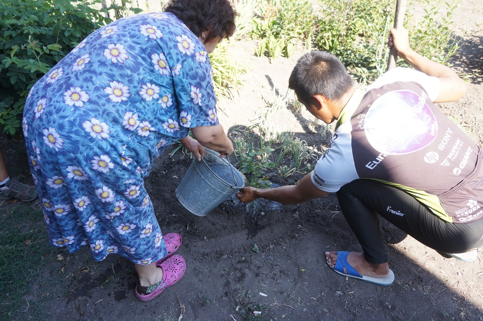 看到老奶奶了解我們要把手上的這一棵玫瑰樹送給她時,透露出驚喜以及感謝的神情,就算語言不通一樣給了我們相當大的鼓舞,因為我們知道她一定會好好照顧牠,讓我們在哈薩克種下了八棵樹苗,也是最後一棵。