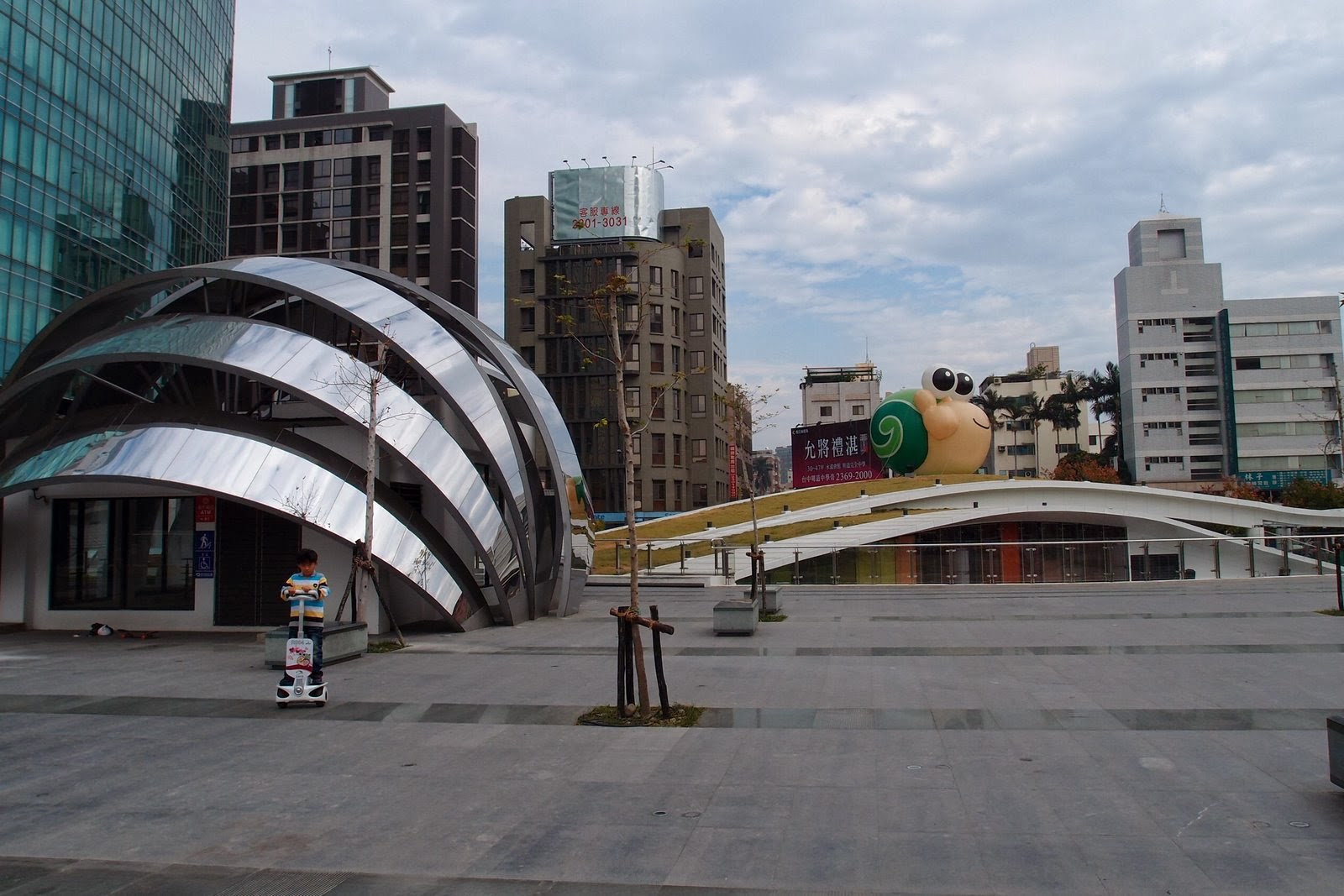 綠色的殼的大蝸牛就是草悟廣場的標誌。銀色像蝸牛殼的建築物則是電梯入口。