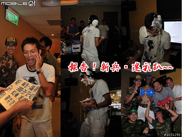 呼~~~我們就在那有驚無險的颱風夜前夕,瘋瘋癲癲的把這“超瞎報告!新兵‧迷彩趴”給結束了……小妹在此深深的一鞠躬,謝謝各位配合一起瞎搞……‧舉凡超專業的超瞎軍官─笑傲…‧超敬業的大舌頭關主─艾力克‧超嚴格的大嗓門關主─鐵公雞‧各個超瞎快閃兵的配合──沒錯就是那天有參與的大家啦!!‧超級特攻隊裝扮的─Timo‧當然還有最最配合的新兵阿鴻啦!!那天被整的很慘、也被灌酒灌的很慘……忽然發現,其實省去被整的的情形,只要把新兵丟到一群有經驗的兵中….就會不停的被灌酒、灌酒再灌酒…哈哈哈哈…只是齁~~~~各位你們嘛幫幫忙~~~去唱歌我要Hi咖啦!!下次總覺得要發螢光棒給大家了~”~May0301 wrote:時間過的很快的.一年很快就過了..祝福你平安順利囉 真的才認識一年(就在今天強風暴雨中額滿了)~~~但真的……好像認識好久好久…….(((((((陷入沉思…)))))))))就等你換新的公路車在跟timo一去來玩off-road嘿~~~哈哈哈哈哈