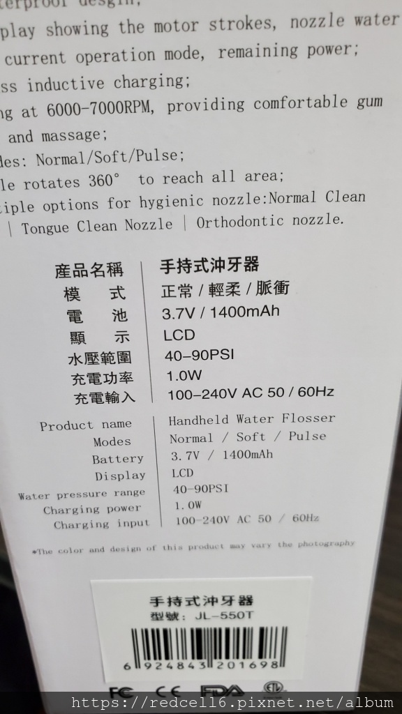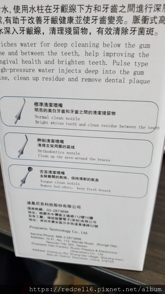 【▼】Proscenic浦桑尼克 JL-550 脈衝水柱無線攜帶手持沖牙機外包裝一覽。(產品特色均詳細列出)