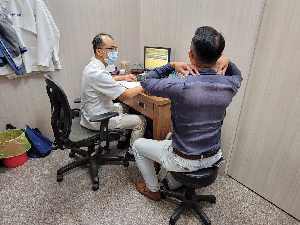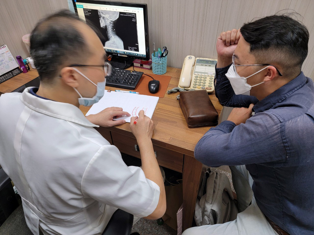 ▼終於輪到我了,院長先詢問我的情況,我交代了一下:肩頸很僵硬、有被擠壓的感覺,休息也沒有改善,持續大概一、二個禮拜了,有去照X光