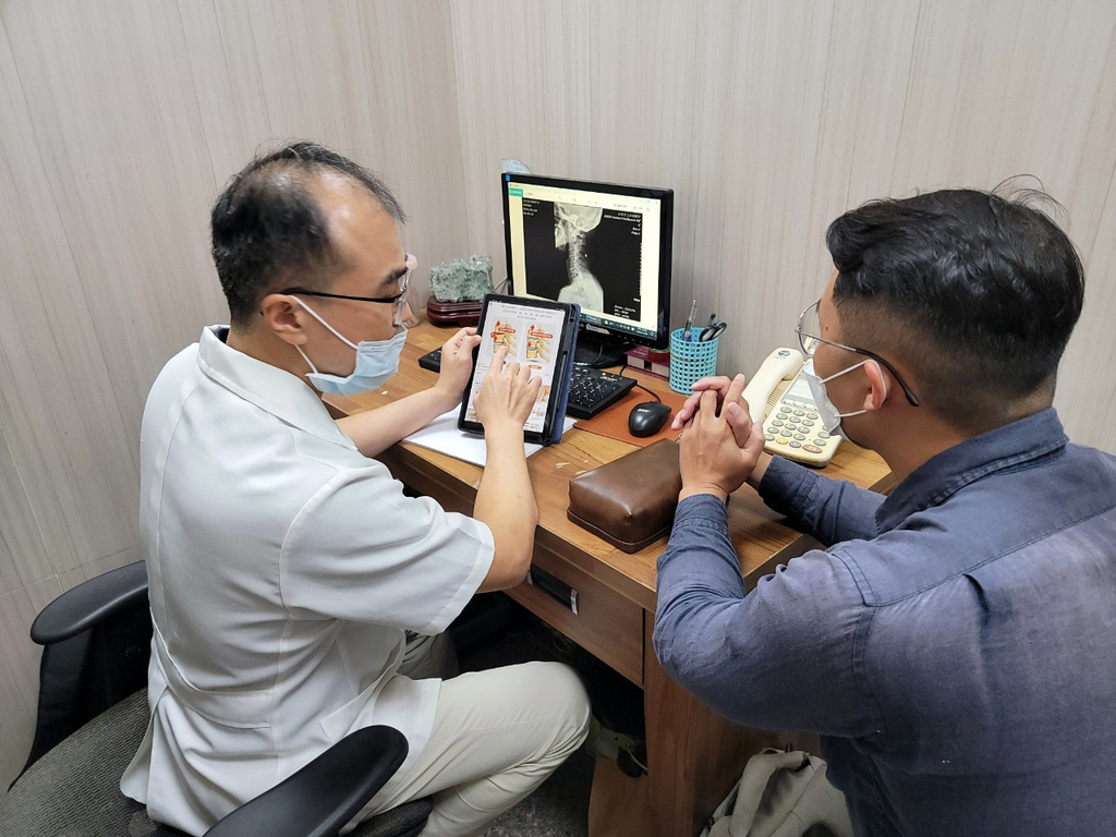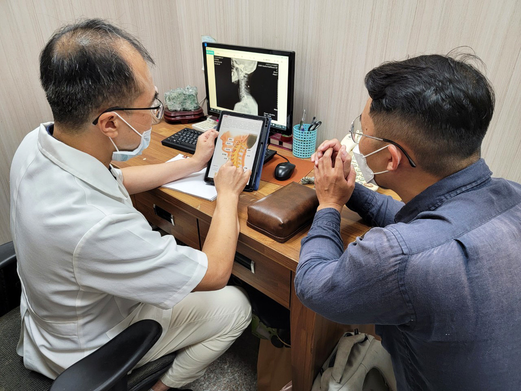 ▼院長說我的頸椎有些微突出壓迫到神經,應該跟我平常使用電腦、低頭滑手機姿勢不良有關