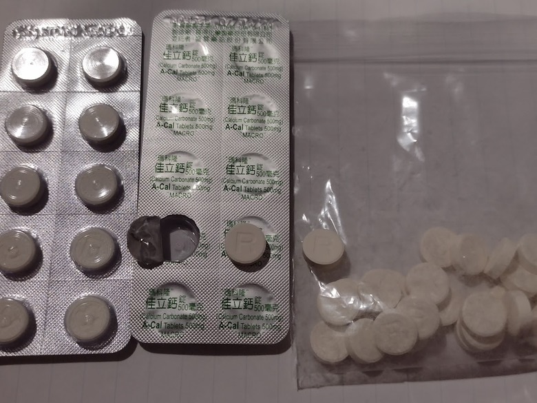 兩種鈣片的合拍圖:左邊是 (鋁箔片裝) vs 右邊的 (小塑膠袋裝) .