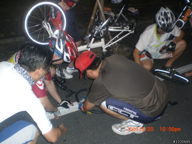今晚真是特別的夜晚,不知是否是農曆初一的關係,小弟第一次的破輪就在今晚,而許多人的第一次(我是指補胎片,工具,拆輪胎)也都在今天晚上貢獻出來.但是小弟的噩運尚未結束,輪胎用好沒多久,發現破輪的花鼓鬆了,騎乘時會搖晃.附近的車店也休息了.想說不用家中女王出動,連絡住附近的朋友幫忙先載回家明天再處理,想不到那些老灰啊近然那麼早就睡了.萬不得以之下,只好請求女王來拯救,回到家已經23:25.感謝各位約騎的夥伴們(譚大哥夫妻,小吳和他的同事,小琳琳,郭董...雖然很多人的名字不曉得),讓你們忙了那麼久.