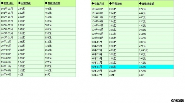 以下是我過去兩年半的電費清單,基本上一個月全戶兩顆表約用掉250度,夏天的電費單應該準吧。這一期因為與去年同期沒有省到電,所以沒有折扣,不過搬來新家約2.5年,每兩個月兩顆電表總金額約在600--1700之間,如果每兩個月都繳1200元,我家一年電費約7200元。