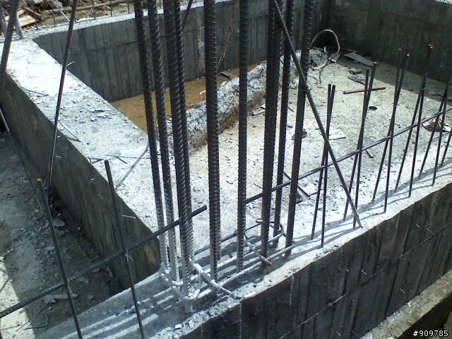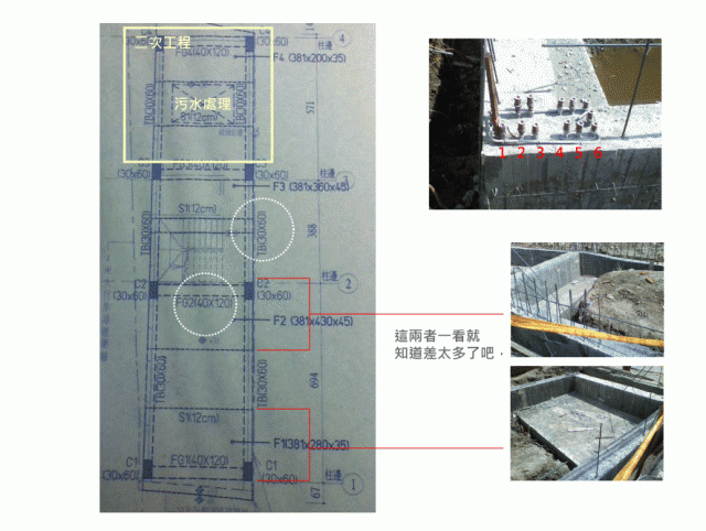 這個只是建築行業中最基本的「識圖」問題而已。一般60%的建蔽率,看到圖中蓋滿滿的就知道有二次工程。基礎版的問題:其實圖中都有尺寸一量便知,就算不量,看大小比例也知道差太多了。基礎版重不重要?如果建築師說沒關係,那反問他日後設計的房子會不會畫上基礎版?每一基礎版尺寸都不一樣,也表示結構技師可是有認真的幫你算過,你不照做,當然責任自負。污水處理槽:如果按圖中所示,建築師應是已有考慮污水處理槽的位置,沒理由來一個放不下,真的放不下,也可以加深基礎而不是省掉基礎版。FG 是 40x120 / TB 是 30x60,依照片看全部是一樣的尺寸。TB 變大了,是比較好嗎?如果配筋一樣照 TB 就不對了,因為這與原始的地樑設計變成不同了,而且鋼筋量也變得不足。最後的柱一側用了六支鋼筋總計14支。中間承載力最大的的卻是 5 支總計 12 支?而就算是二次工程,柱搭接也不應是在樑柱接頭吧?包商說的是不是實話?有沒有按圖施工?也許鋼筋號數也應再核對一次看看吧
