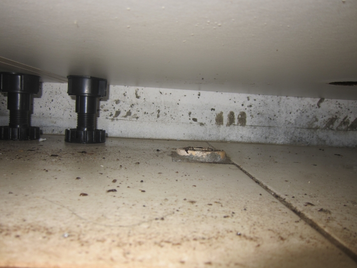 踢腳板看起來不像活動式的,請櫥櫃公司來處理,或者你會簡單木工,就可以暴力拆,有問題再買新的踢腳板重裝,你的排水孔有點小可能也要請櫥櫃公司幫你擴孔再蓋上修飾蓋,另外你的排水孔以後也有阻塞通管的需求,趁這次也把踢腳板改活動式的,方便以後通管維護,所以不要掙扎了請櫥櫃公司來處理是最實際的做法,否則自己搞的錢比請櫥櫃公司來還更多