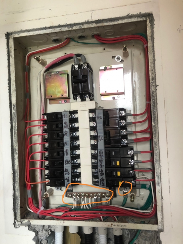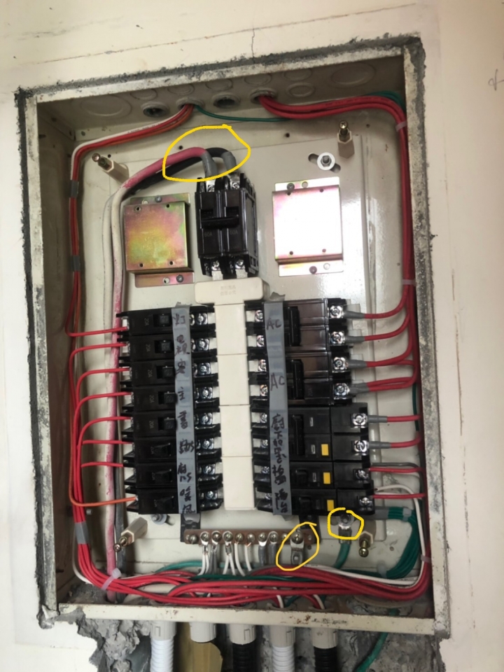 不好意思,借用版主的文章。最近也有重新配電,可否請板上的高手,幫忙看看這配置有沒有什麼問題呢?1. 請問下圖黃框處是四線進對嗎?紅線;火線黑線:火線白線:中性線(水線)綠線:地線不曉得這樣對嗎?2. 請問下圖需要將 水線跟地線相接嗎?3. 請問下圖是2組220V共用一個無熔絲開關嗎?一般會這樣處理嗎?非常感謝!