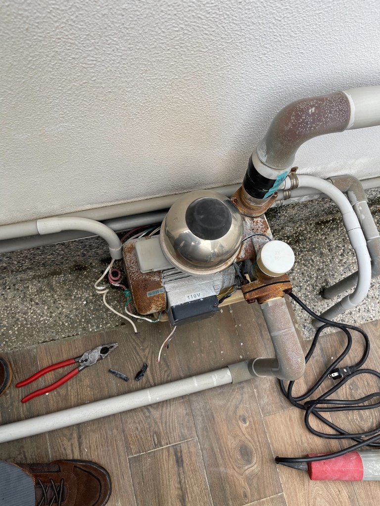 ▼同樣也是機器老舊的問題,效能變差了,反正都要換了,乾脆一次換一換,所以請水電師傅拿新的電子式穩壓機和抽水馬達來換,也省得我要常常排出時間修水電。