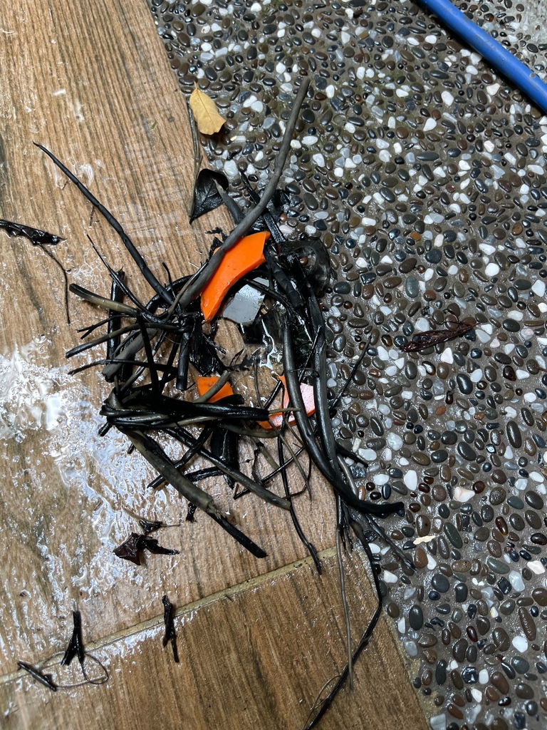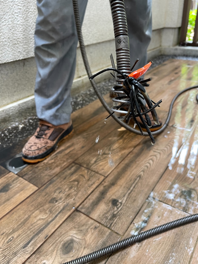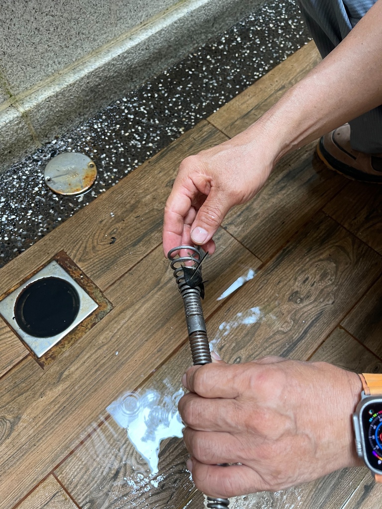 ▼首先是排水管堵了,以前風平浪靜沒感覺,颱風來、水淹了…我們也不知道到底原本就塞還是颱風吹來的垃圾塞住了,總之我們也挖不出、通不了,只好叫水電師傅來一趟。