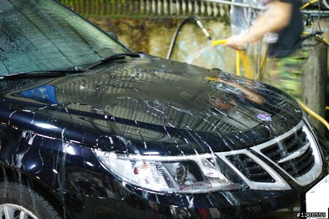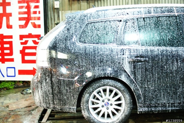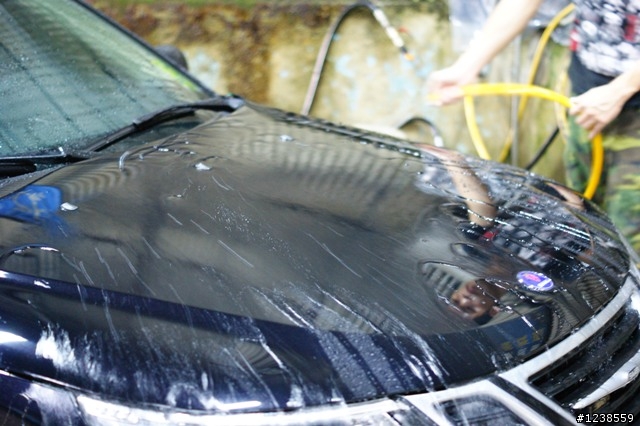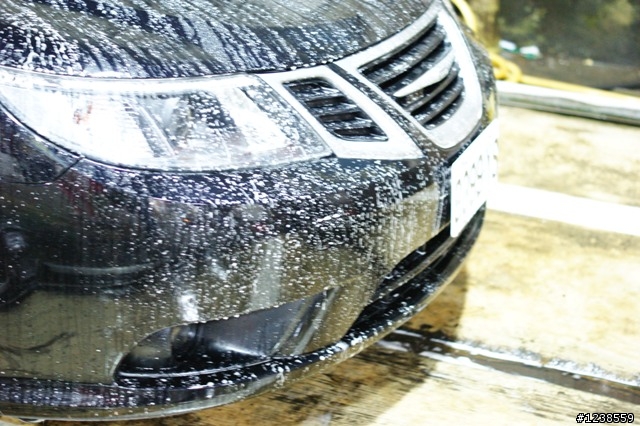 噴上泡沫,有點神奇,泡沫竟然如同如同小雪花,均佈在車殼上,而且順著車門很快的就流下來,這撥水性真好。
