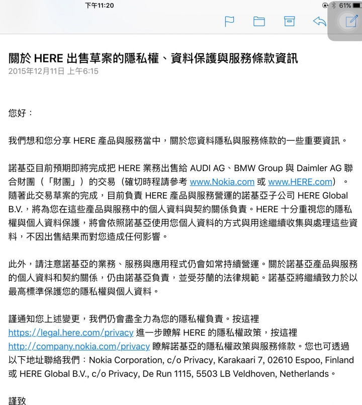 101個理由 wrote:here圖資太弱了...(恕刪) http://support.volvocars.com/tw/Pages/category.aspx?category=e36a82ba91e3ebbdc0a8015160fce4ac使用MapCareTM2016車款年份起製造的車款可選擇免費線上地圖更新(Life Time MapCareTM),請參閱Sensus Navigation地圖下載。更新可一年執行2至12次(依據地區而定)。您也可以透過您的 Volvo 經銷商去存取已更新的地圖。Life Time MapCareTM會至少提供至2025年。至維修中心更新地圖您的Volvo經銷商可協助您更新與下載地圖。地圖更新服務本身免費,但經銷商可能會視安裝地圖所需的時間向您收取計時工資。