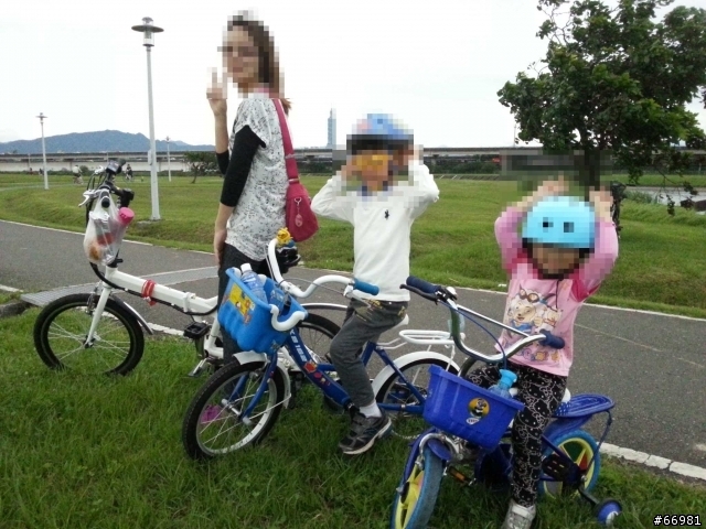 兩台腳踏車是小孩子騎的, 都是四輪的(後方多兩個輔助輪),