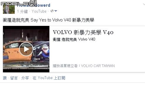 1. 將以下【VOLVO 新暴力美學 V40】影片分享至個人Facebook塗鴉牆上