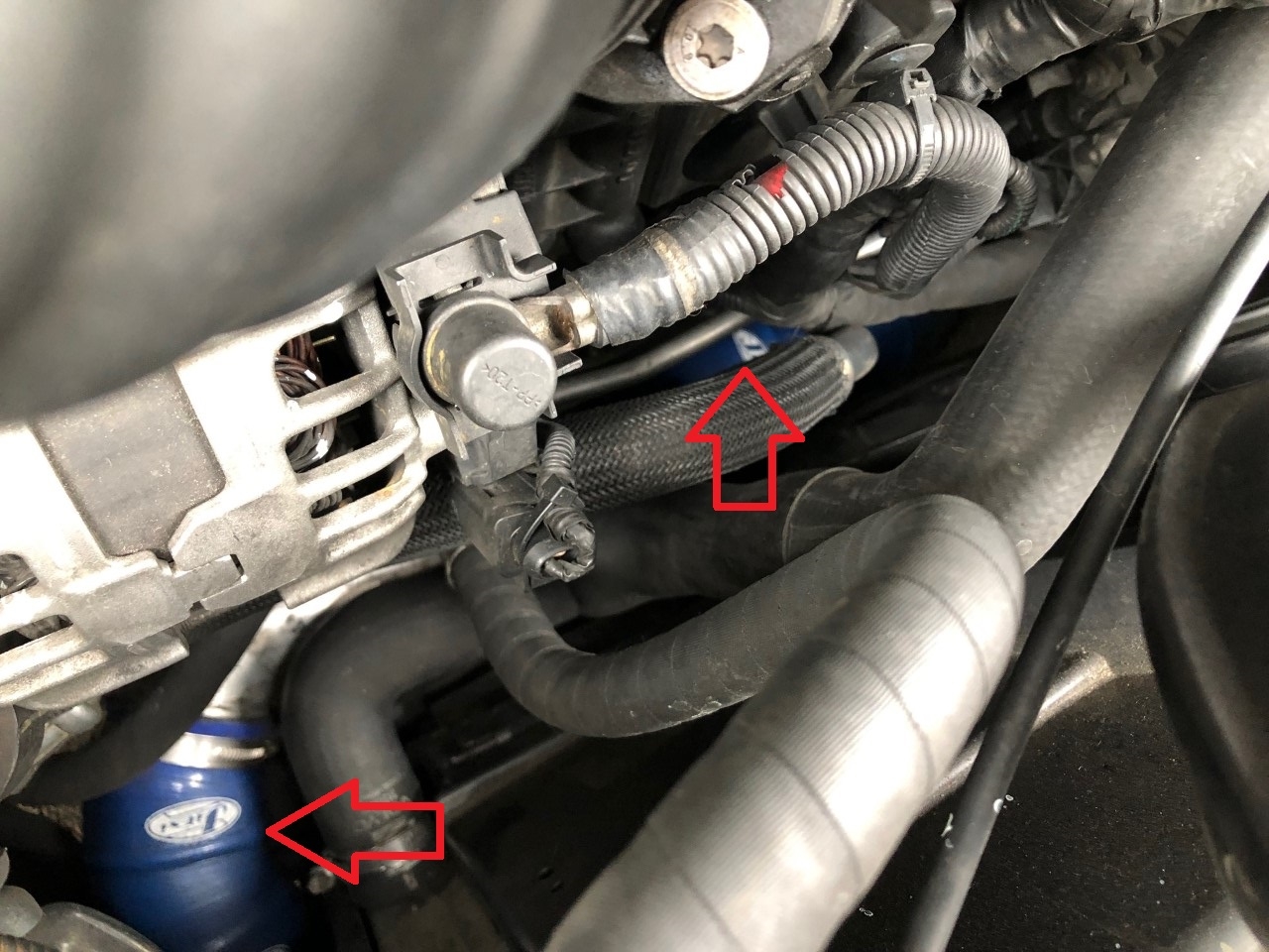 7.左箭頭為尾段矽膠渦輪管(接中央冷卻器)、上箭頭為中段矽膠渦輪管(頭段使用國產大貨車矽膠管):