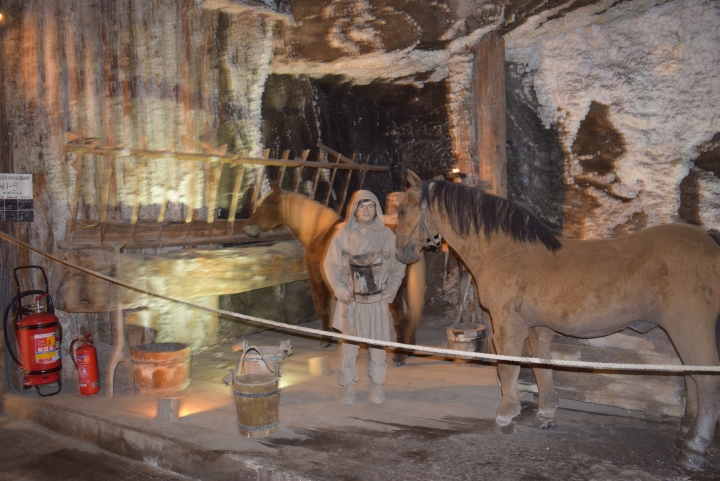 推開紅柵門專人控管電梯統計人數流量進入電梯後視覺沒有遮蔽快速流動光影直往地心奔去隨著離地越來越遠氣溫也迅速降低突然停止機械動作柵門打開舉目所見都是鹽壁 鹽牆 鹽地歡迎來到舉世無雙的地下鹽礦城威爺利奇卡~
