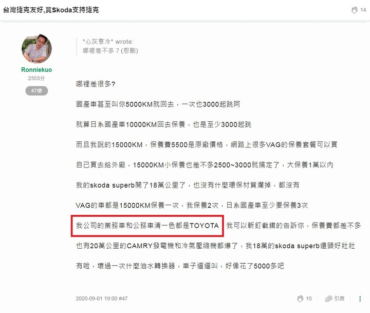 貴公司不正是最愛買TOYOTA嗎? Ronniekuo wrote:你說的是妥善率,TOYOTA引擎的妥善率很好,這無庸置疑但性能數據都是最差的,TOYOTA ALTIS在台灣那具萬年不改款的引擎,有加速度比這具引擎還慢的車子嗎?你不在乎引擎性能,可是我覺得應該蠻多人在乎的