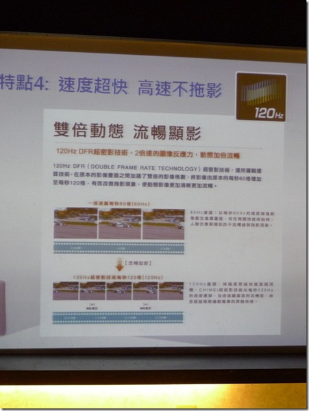 第四項特點,則是120Hz DFR超密影技術,足足是一般液晶顯示器60Hz影像速度的兩倍!而此項技術,是使用邏輯運算技術,在原本的影像間加插運算出來的畫面,達到每秒120格畫面,讓人眼無法察覺不流暢感與拖影現象。至於這樣技術效果如何,等會試玩極限競速3時,就可見分曉了!