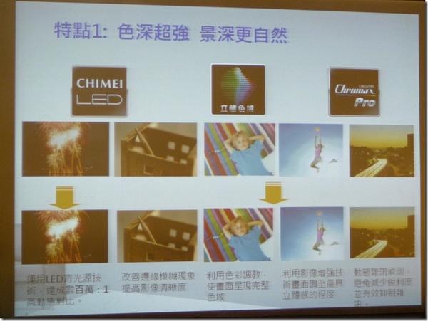接著開始介紹Z系列四項特點。第一項特點,是利用CHIMEI背光源技術、720度立體色域顯色科技,以及ChroMax Pro影像優化平台三項功能特性,達到高動態對比,提高影像清晰度,使畫面最具立體感和呈現完整色域,並能有效抑制雜訊。
