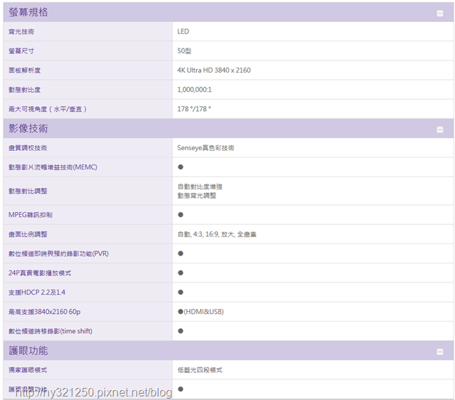 下面是官網列出的BenQ 50IZ7500護眼4K大型液晶的主要規格,詳細完整的規格請點選這裡到BenQ官網觀看。