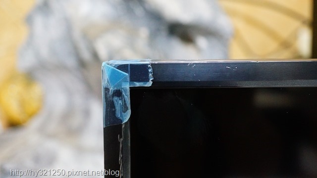 為了保護這台液晶顯示器邊框不會在送貨過程中磨損,四邊邊框都有貼上膠帶保護。