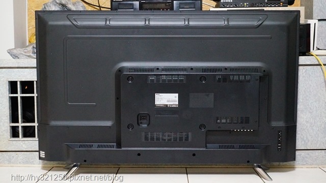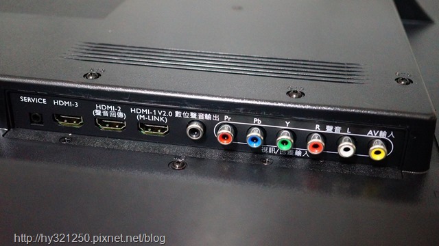 位在背面底部的輸出/輸入連接埠,從左到右分別是Service插孔、三組HDMI連接埠(HDMI 1為HDCP2.0版本)、數位聲音輸出插孔、色差端子與AV輸入端子。