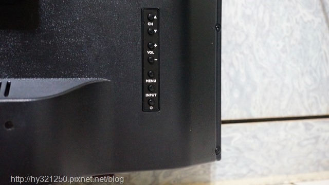 背面右下方有的簡易功能按鍵,包含頻道選擇、音量大小、主選單、輸入訊號源選擇與電源啟閉按鍵。