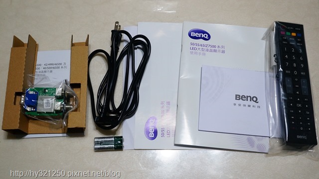 BenQ 50IZ7500隨附的配件,包括視訊盒、電源線、使用手冊、遙控器與兩顆四號電池。