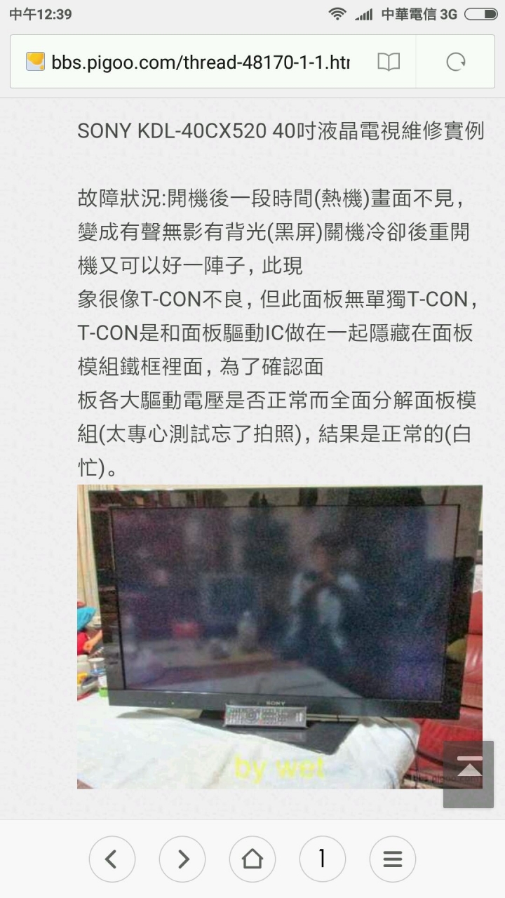 eatingben 98 wrote:我的Sony 40C...(恕刪) http://bbs.pigoo.com/thread-48170-1-1.html 維修方法信號排線接解不良,晶片過熱。拆機清一清,加一個散熱片(電子材料行可以買到)。故障情況一樣才適用此法,加一個散熱片。散熱片,風扇二選一,或兩個都加。