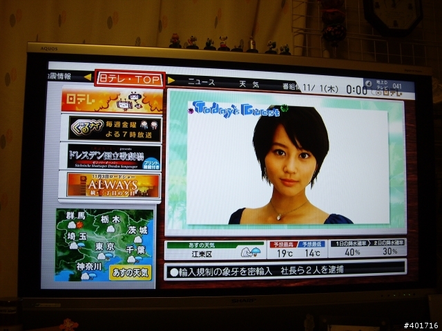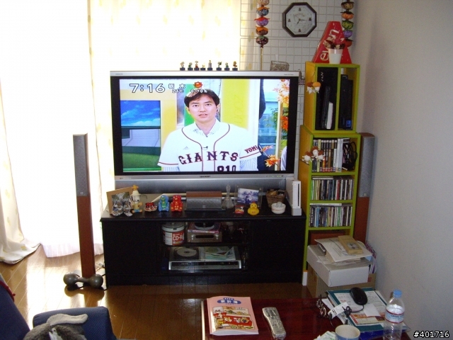 看到大家的客廳都一一的擺入液晶電視、電漿電視,準備迎接未來真正全數位的電視,光是作看大家文章的我也很感到興奮。我住在日本東京,在這已經是數位電視充斥的環境,還沒用看數位的人已經有點落伍,偏偏我三年前才剛換電視,而且還是換了個映像管的沒數位功能的電視。所以液晶一直對我而言是得存到2011年,日本陶汰掉類比電視時,才打算要買的計劃。結果,上天照顧我吧,在我這個不到三坪的客廳,進來了一台45吋的Sharp液晶電視。不過這台是2年前的款式了。甚至還沒dvi或crt的電腦輸入。不過以他是sharp又是45吋支援full hdd,hdmi一組,d4色差2組就已經讓我很滿意了。我也想擺入一張照片和大家分享我的喜悅。