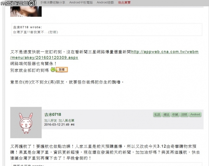 吉米0718 wrote:三個國粉連三發還能...(恕刪) 我回版友攤提成本一天多少錢也是我個人所能接受的標準自己購買機種連型號也有寫上提供做為參考http://www.mobile01.com/topicdetail.php?f=347&t=4886290&p=1你也能嘴砲說我購物專家(非常離題)前提是.我有拿雜牌大尺寸來比高規格嗎....才是有失公允CP值是依個人需求除了價格以外 規格也是重點有空去看看版友對目前電視看法及建議 至少不會像你這般偏頗http://www.mobile01.com/topicdetail.php?f=347&t=4891100&p=2跟你這種說理.浪費我的生命你買是你家的事!我買關你何事?上01主要爬文跟你並不同.別與我相提並論看看這幾年你發文主題就很清楚!!!在我眼中你真的是標準問問哥+不然就是上來抱怨!!發文問問題沒錯是你個人非常多問題.只要回覆不如你預期的答案就是護航嗎??再看看我這篇開箱文章.有提到過畫質好或任何字眼嗎?這麼喜歡無故加料對我來說~cx600可以調整適合自己的觀看習慣入手價格便宜時機也對.就算3年之後壞掉也不會那麼失落一切事端都由你挑起 被砲就說他人是國粉一下子說遙控器粗糙\一會兒又說畫質不好cx600不適合你.不代表cx600不好少在那地球非與你同轉吉米大大拍照只是證明你有買.順便說服大家對你的質疑順便補你的開箱心得文,而不是證明你說的都對!拍張國際牌保證書證明你也有買.連買都沒買!是在裝肖煒嗎??要出來批評之前至少提供有力證據!!拍幾張照那麼難嗎明天之前你若未補圖上來.我只好把你論述當放屁8/16 還是沒有等到我想看到圖(可惜) 已將吉米大大加到黑名單.訊息中刻意挑起對立內容已提交管理員註: SONY 70w850電視外觀+保證書+8台電視遙控器見識一下哪一款不粗糙的.(照片)開箱文