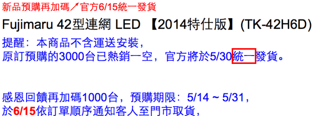 我也是4/27訂~~剛剛接到電話說6/10才可以到貨!!請問這可以投訴嗎?聽說現在到貨都是先給門市訂貨的~~我們網路訂都是最後才給!當初網購也不能分期~~也不能馬上拿到貨!!真的當我們消費者是白痴嗎這次真的對燦X很失望!!難怪一堆人說買燦X~東西不是常壞不然就是常常延貨!!阿湯哥 wrote:請問下訂時會要求選擇...(恕刪)