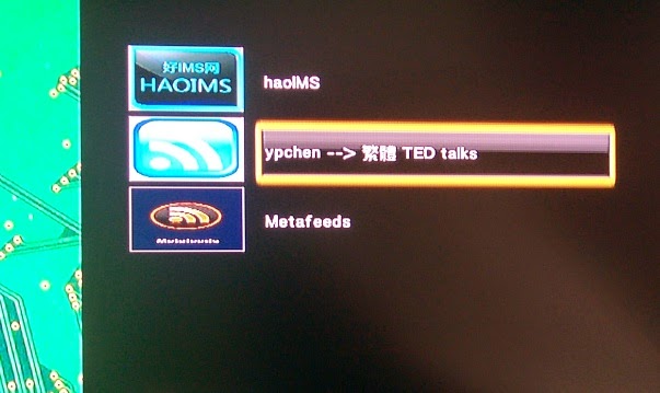 jovial wrote:請問HD-A5可否透...(恕刪) <方案之一>如果沒有內藏 ypchen link 的HD-A5軔體,可以先看看您目前使用的軔體中有沒有「好IMS網」(HAOIMS)連結。如果沒有,可以選擇刷 淡水 3.0.1 (google:HD-A5 淡水 3.0.1 )。如果有,就繼續兩步驟:1.到http://electronmania.blogspot.tw/2013/12/ibt-1283.html下載「兩個 scripts 目錄」。看文中說明,將檔案 co 入隨身碟。2.隨身碟插入 HD-A5 前面板插孔。HD-A5 -->「好IMS網」-->U盤自定義1 --> sdb1自定義就可選 ypchen --> TED talks 。