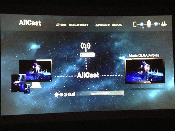 將手機開啟wifi,連接AllCast開頭的網路並輸入密碼(於畫面上方)