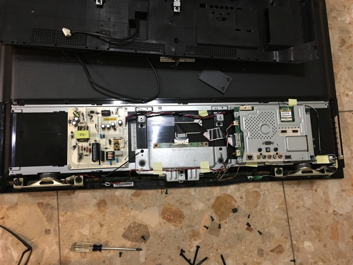 剛剛打開看裡面估計是左下角的那塊驅動版有問題先簡易處理了這個排線金屬介面估計就是這片板子有問題待會組起來看看金手指清理後有沒有效果找外面的人修沒啥意思,液晶電視是耗材,修不好就該丟了.但這台才兩年多,品質實在不好.