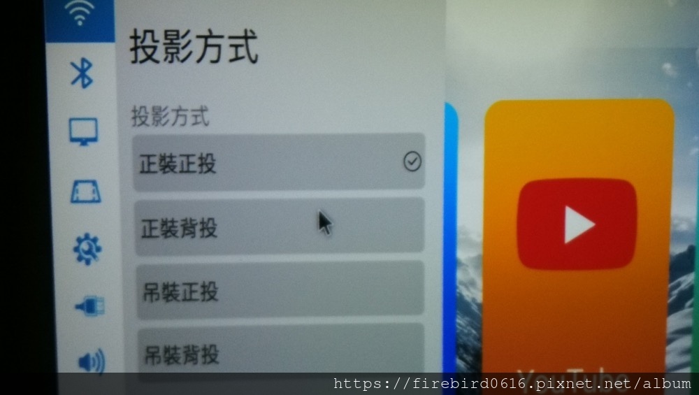 將設定從『正裝正投』改為『吊裝正投』,畫面會上下相反,這樣躺在床上看才會是正的。
