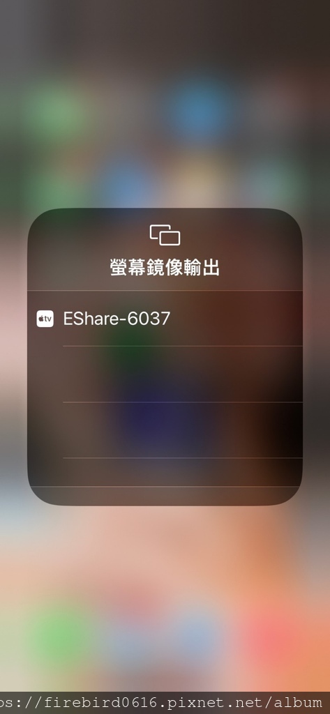 iPhone AirPlay連線方式非常直覺,就和連接AppleTV一樣,只要從下拉選單中點螢幕鏡像輸出圖示,找到Eshare-XXXX,點了畫面就會開始同步化。