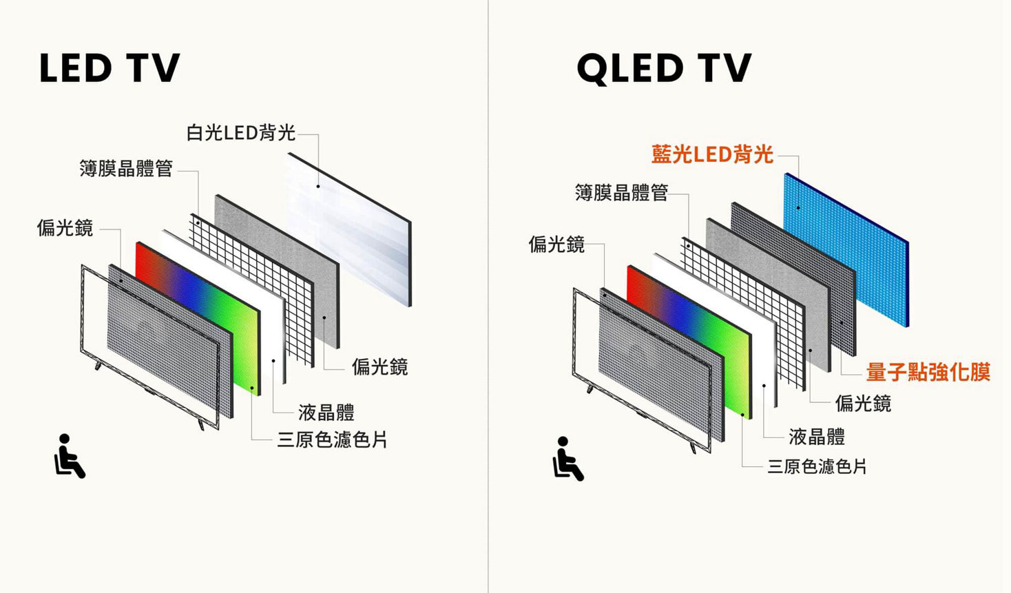 https://image.benq.com/is/image/benqco/how-to-choose-qled-tv-04?$ResponsivePreset$&wid=1468從以上的結構圖基本就是藍光LED 打到有量子點的光學膜後讓顏色變得更鮮艷也就是色域提升。