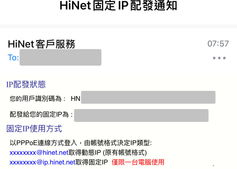 中華電信 HiNet 預設所有用戶為8個浮動IP,可以透過向中華電信申請,更改為1個固定IP + 7個浮動IP,每天只能更改一次設定。