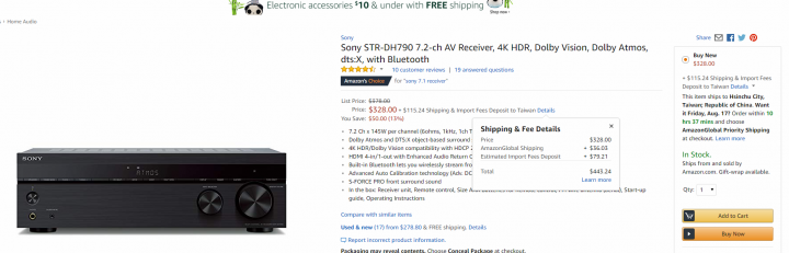 小遊305 wrote:好喔。謝謝各位大大的推薦跟建議小弟我預算不高,所以先往萬元左右的擴大機。有大大推薦一萬多價位的環繞擴大機嗎?還是有那幾台CP值不錯的?謝謝...(恕刪) Sony STR-DH790 7.2-ch AV Receive美國亞馬遜上的賣的,可寄送台灣。入門機型,7.2聲道,先進功能都具備。台灣賣 $19900 定價,實際成交價看你談的功力。美國亞馬遜上約 14000 元之內可到手。(包括運費與關稅)。