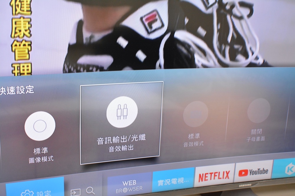 並開啟訊源裝置的音源輸出至對應的音源輸出模式(這台Samsung電視只有光纖輸出),裝置聲音就會透過TT-SK023輸出。