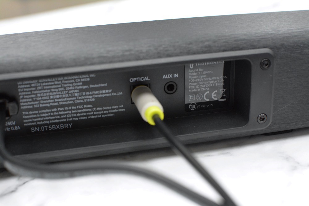 背後的音源輸入孔可以使用光纖(OPTICAL)或是立體聲(AUX IN)連接外部訊源,搭配一般電視沒有問題,另外內建藍牙5.0接收功能,是較目前目前在Amazon上販售的藍牙4.2更新的版本,藍牙連線更加穩定。