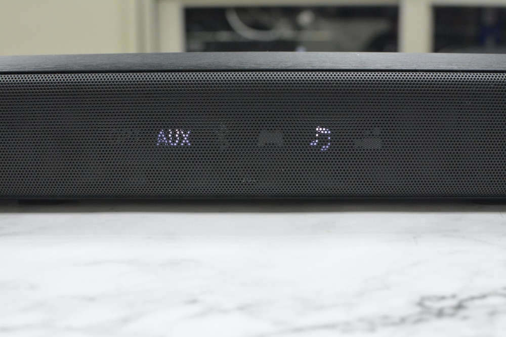 透過金屬網罩,可以看到正面中間的工作狀態指式燈號(音源模式/音效)。