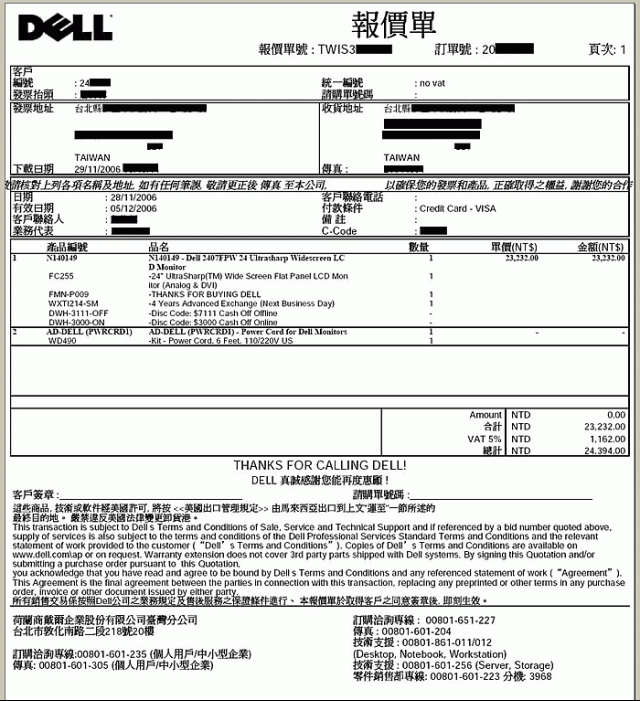 小弟我原本看上 Viewsonic 的 VM2245WM 那個 ipod dock 要準備痛下殺手把它敗回來,結果不小心 (天意!?) 到 Dell 台灣網站看到 Dell 2407FPW 的外型跟價格,就毫不猶豫地投靠 D 營,昨天就掏出埋在皮包裡許久不用的信用卡...把它訂下去...,今天就接到 Dell 的業代打電話確認無誤,準備等待它的來臨。有圖有真相,附上Dell的訂單讓大大參考。我除了買 2407 之外也另外再買一年的保固,所以整個價格還不超過25k,我個人認為實在是划算。等到 LCD 到手後,我再找時間另行po我的感想。