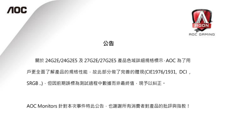chaoyl wrote:官方粉絲頁已經回覆了(恕刪) =========所以針對 AOC 24G2E5 已經 規格購買的消費者如上AOC 承認錯標規格那可以全面回收 ???? 差的規格, 給消費者???退錢 退貨, 補貼 對已經購入消費者的作法是????身為 AOC 品牌怎麼都略去不談????別忘了國內手機廠 芯片風波