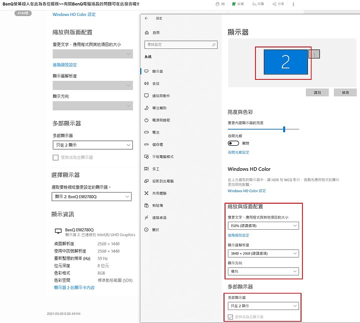 WHme666 wrote:螢幕解析度跟文字大小 螢幕解析度跟文字大小是可以調整的(如果電腦端設定正確)解析度也可以顯示4K(如果筆電的顯示晶片輸出夠力)以下是我筆電的設定與螢幕的顯示看起來您的顯示晶片與我的不同,設定也不同例如:1.顯示晶片雖不夠力,但解析度仍可輸送4K到顯示器解析度設定建議值(如顯卡夠力且HDMI線支援)2.電腦單螢幕輸出到螢幕,並指定EW2780Q設為主位畫面並調整左右位置