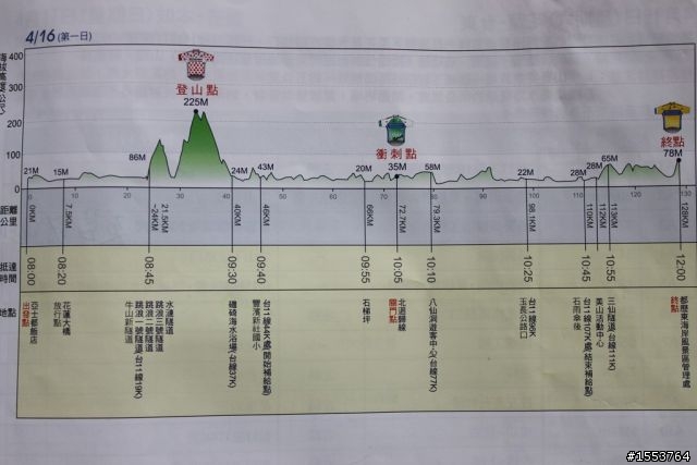 謝謝阿光幫忙撈照片, 也謝謝不斷來電關心詢問的隊員. 這是一個緊張又刺激的週末, 也是我參加花東賽以來最精采的一次. 相較之下, 以前的幾次可以說是累積參賽經驗, 只求完賽, 不求表現. 往往都是今天下飛機, 明天就上戰場, 沒有準備. 而這次有專人指導, 每日盡量照表操課, 雖然時間只有短短一個月, 但很想測試一下自己經過這樣的練習可以達到甚麼程度.D day -1 2011/4/15 星期五 南投-花蓮星期五早上八點出門, 準備跨越武嶺前往花蓮. 天氣好到爆, 心想, 如果明天的天氣也是這樣, 那就熱死人了.三個人三輛腳踏車, 車上裝滿備用輪組.到了清境最高小七, 遇到一位單車自助旅行背包客. 他的腳踏車上裝載了65公斤的行李.補一下永遠美麗的武嶺高山風光遇到施工過了觀雲, 我實在太想睡了, 就將方向盤交給手機哥. 換到副駕座去呼呼大睡. 星期三四兩天, 因為工作繁忙, 台北南投兩地跑. 多少有點疲累. 睡了一個多小時, 醒來發現阿德竟然在暈車! 手機哥可能是用上了藤原豆腐店的駕駛技術, 讓K明以後多了一個暈車的伴.下到平地, 接近花蓮時, 看到路旁一個騎車的熟悉身影. 是以前RST的林大哥, 這次要幫左岸單車隊作補給, 今天竟然從台北騎腳踏車過來花蓮. 真是猛男一枚.大約兩點半抵達今日下榻處翰品飯店. 與前來支援補給的Nina和三德教練會合後, 將腳踏車留給他們, 我們就先去吃飯.將腳踏車留給他們做甚麼? 裝備檢查與保養. 我出門比賽這麼多次, 除了自己將車子牽去車店檢查煞車變速以外, 頭一次有人將我當成職業選手一般, 幫我檢查車輛. 三德教練和Nina細細檢查每個小細節, 包括將卡在外胎中的小石頭小金屬片, 任何細微的東西都一一挑了出來. 加上前一日就抵達花蓮的冠霖, 四輛腳踏車他們兩位花了一個多小時的時間檢查調整完畢, 然後放我們去試騎.試騎完畢沒有問題回來, 洗完澡洗完衣服, 又趕快再去吃一頓晚餐. 今天一定要將肚子填得飽飽的, 明天才有力氣騎車. 而且還要吃很多的蔬菜, 明天早上的輕量化才不會有問題.回到飯店, 與Nina三德討論完隔日的補給策略, 再自行健復按摩一番, 便早早上床休息. 在我們吃, 睡, 等待比賽的同時, 就只見Nina與三德不斷的忙進忙出, 前往亞士都飯店開領隊會議, 準備我們明天的補給事宜等等, 忙到三更半夜只能吞御飯糰充饑. 他們堅持我們參賽選手就是將自己身體照顧好, 比賽時努力奮戰; 其它這些補給與行政事宜我們連碰都不給碰. 三德另外還要幫香港卓比奧斯隊動態補給, 雖有Nina全力協助, 但人手還是不足, 作起來格外辛苦.D Day 2011/4/16 星期六 花蓮亞士都飯店-台東都歷 127.5KM一早醒來, 窗外陰天. 但絕對有潛力變成艷陽天. 昨天啃的蔬菜果然有效, 還沒下樓吃飯就先投了一次彈. 吃到一半, 又投了一次, 可說是清(輕)得乾乾淨淨. 早餐吃了一堆烤麵包和生菜沙拉, 一樣是要吃飽.著裝與準備出發一趟要吃掉的補給品行李上車後就在附近繞圈熱身. 今天踩踏的感覺還不錯, 雖然腿腳有些乏力, 但想來也是正常. 到起跑線前等待出發時, 熱辣辣的陽光已經曬的皮膚生疼. 我得轉過去背對陽光多少躲一點曝曬.(廣告時間: 在此推薦一款強哥介紹的防曬乳. 系數高, 不油膩, 還有清涼的感覺. 意者請洽強哥)今年RM40和RM45合併出發, 形成出發梯次中最大的一團, 有175人. 各梯次間隔七分鐘出發, 輪到我們出發時已經過了8點半, 曬得頭都有點發暈. 倒數5-4-3-2-1-鳴槍起跑! 前8公里是熱身段, 速度不快(今年真的不快), 穩定跟著集團就好, 將身體完全熱開; 左轉花蓮大橋, 集團開始騷動起來, 在橋上有人便開始往前擠. 過了橋左轉馬上是一個300公尺的爬坡, 我加速往前, 將自己安插在比較靠近前端的位置. 上了坡頂轉成平路, 整團的速度開始加快, 我屢屢往前推, 保持在前端約十位車手的後面. 穩穩的推行到了跳浪1-2-3-4號隧道, 三德教練賽前提醒的策略奏效, 隧道中的光線昏暗, 高速進行中一定要搶在前頭. 出了隧道下坡, 我的位置稍微往後退了一些, 趕快補給吃東西和喝水, 準備在牛山釘住主集團, 甚至要攻進領先集團.不一會牛山到了. 集團瞬間慢了下來. 我維持穩定的踩踏, 從中間位置靠左側超車道一個一個的超越. 集團的尖頭群就在前方, 沉住氣再超越一些人今天基本上就可以有happy ending了. 就在此時, 一位車手從道路外側忽然切進來我的前方, 後輪猛力往我的前輪一撞, 我應聲就被彈了出去, 摔倒在路中央的雙黃線上. 混亂中不及看是哪一個XX和他的號碼, 七葷八素中聽到後方一位車手也撞上我倒地的車後也摔了. 摔倒後自然就脫了卡, 兩條小腿都好痛! 右小腿是瞬間的出力導致抽筋, 痛到不行; 而左小腿則是被大盤扎了兩處, 破皮紅腫. 趕緊爬起來檢查車子, 前後輪都歪掉了, 尤其前輪偏擺嚴重, 會卡到煞車皮. 變速也跑掉. 手機哥從我旁邊經過, 我揮揮手表示沒事. 深呼吸喝了口水, 等小腿抽筋的疼痛過去, 一邊想接下來要怎麼辦. 這一摔, 把我的信心給完全摔掉了. 身體和裝備兩者皆傷. 不想了, 回過神來趕緊追上去要緊. 前輪偏擺, 就將煞車扣打開, 盡量不要用就是了. 掙扎騎上車, 繼續爬坡往前. 主集團當然已經不見了, 我一邊踩一邊緩緩拉了一下小腿的筋, 還是好痛. 不管了, 上到坡頂再說. 將小腿放輕鬆, 盡量拉抬大腿, 在坡頂前追上手機哥, 打算一起追趕主集團.掙扎著過了坡頂, 開始下坡, 我的另