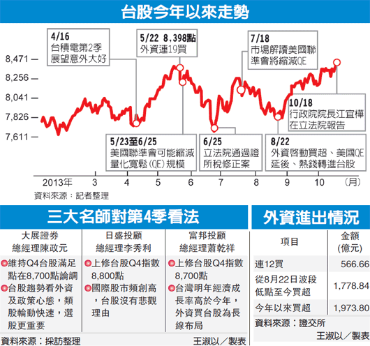 蕭乾祥說,美國量化寬鬆(QE)未退場,使得資金從美國重回亞洲,並以流向台股及韓股為主,且配合債市資金轉向股市的推波助瀾,使得當前資金面充沛,上修台股第4季高點至8,700點。