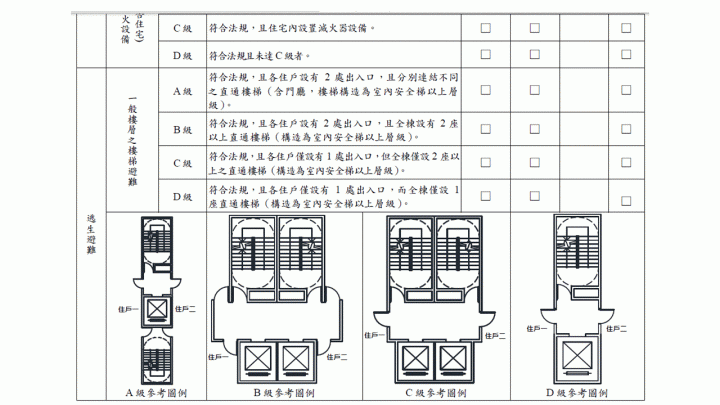 先說聲抱歉,看到太多似是而非的言論誤導所以還是要澄清一下,新舊房屋的確在公設上有很大的落差,只重視室內坪效的可以跳過不看.....,政府法定每年都在增加安全防災的規定,仍是導致新大樓公設會比較高的原因。簡單說政府為提升住宅性能仍然做了許多的規定供參考,下面是內政部住宅性能評估的網址:http://www.cpami.gov.tw/%E6%9C%80%E6%96%B0%E6%B6%88%E6%81%AF/%E6%B3%95%E8%A6%8F%E5%85%AC%E5%91%8A/15752-%E4%BD%8F%E5%AE%85%E6%80%A7%E8%83%BD%E8%A9%95%E4%BC%B0%E5%AF%A6%E6%96%BD%E8%BE%A6%E6%B3%95.html下表明定了設置消防灑水的大樓安全性是遠高於未設置消防灑水的公寓(A~D四個等級)下表則說明哪種逃生方式最為安全(A~D四個等級),公寓甚至只設了單支直通樓梯,連D級的安全梯都算不上上面兩張圖都是從內政部規定擷取下來的,所以說不管是買房或是租房,最好還是選安全係數較高的房子住起來會更安心,更不用說舊大樓還有廁所管道間貫通會造成煙向上串流的危險性,仿間也有許多說明管道間需各層阻斷(層間塞)的安全說明書籍可參考,此篇回文只想提醒說明買屋除了考量實坪使用空間外,仍是要考量居住安全才是重要的課題,供大家參考。